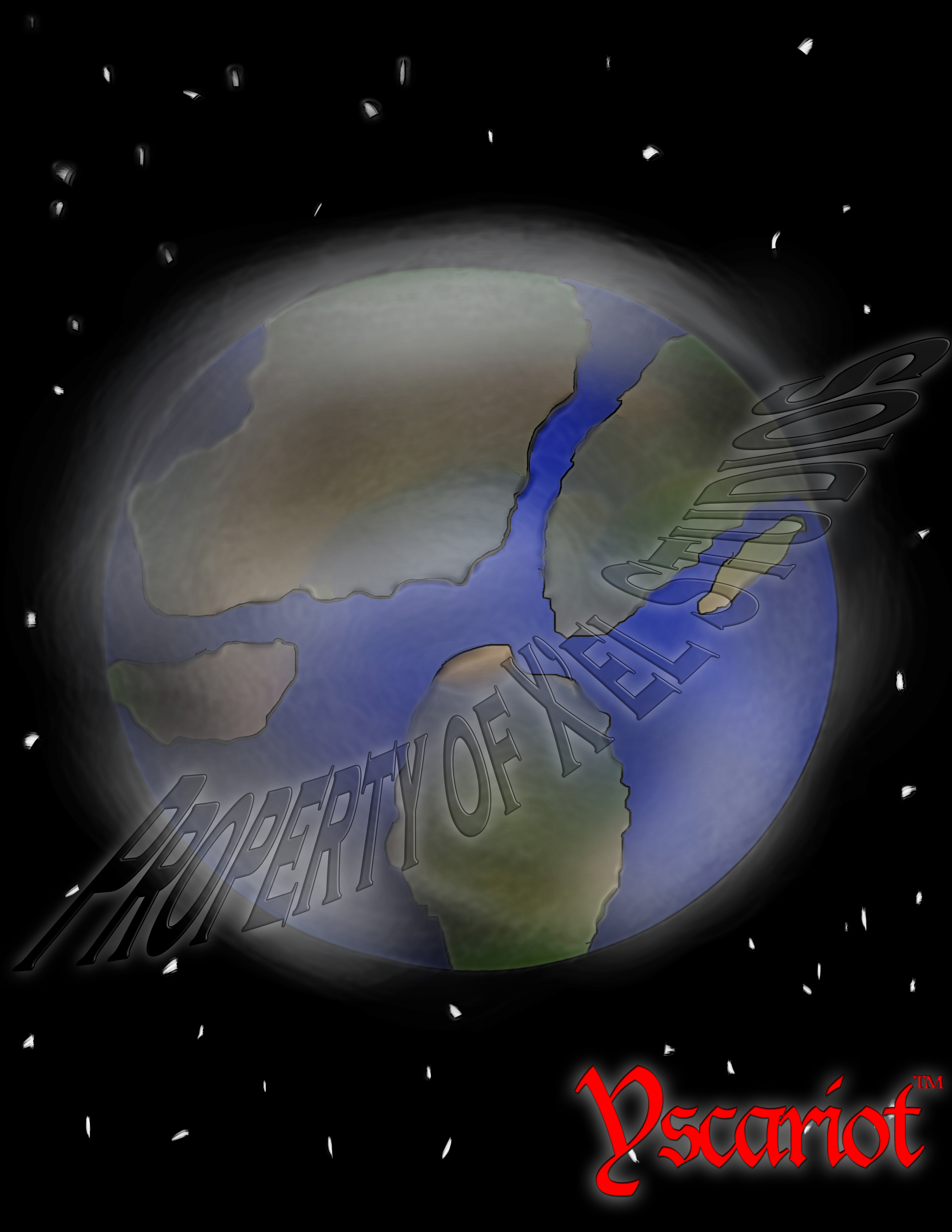 The Earth is the primary planet in which Yscariot™ takes place. Originally, Earth Actual (the real Earth), or True Earth, was to be the location of the story. The story started in Tokyo, Japan and Yscariot’s story took place in the USA. During the first 14 years of the story’s conception, the author wanted the story to take place in a new Texas (his home state), but move some of the action sequences to the deserts of El Paso, Dona Ana (NM), and New York City (NY). However, the cost of travel seemed to be a huge challenge for Medina, and he eventually decided before the 15th anniversary to announce on Facebook that his story will take place on a “new kind of Earth”. On January 2013, Medina announced Earth’s new concept. It will take place on a ‘post-Pangaea inspired’ Earth with the continents being renamed. Each continent contains a name that is either a portmanteau of Earth Actual lands or a tribute to Earth Actual cultures. The Earth, as it appeared in the Alpha preview, was redesigned with experimental airbrushing by the creator to demonstrate what the planet looks like in the story. The physical body of Earth in Yscariot™ is smaller than Earth Actual but not by a large degree.